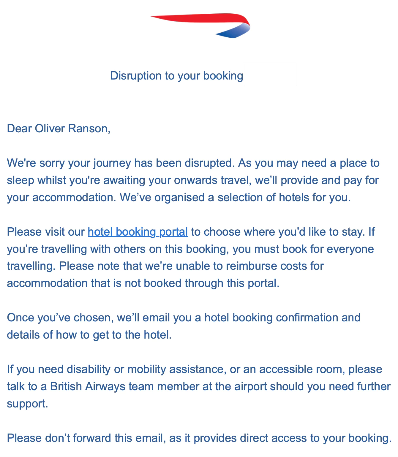 BA said in the e-mail above that they would send me hotel options. While I was waiting for these I popped over to the airport terminal hotel to see if they had rooms. They did. But I waited.